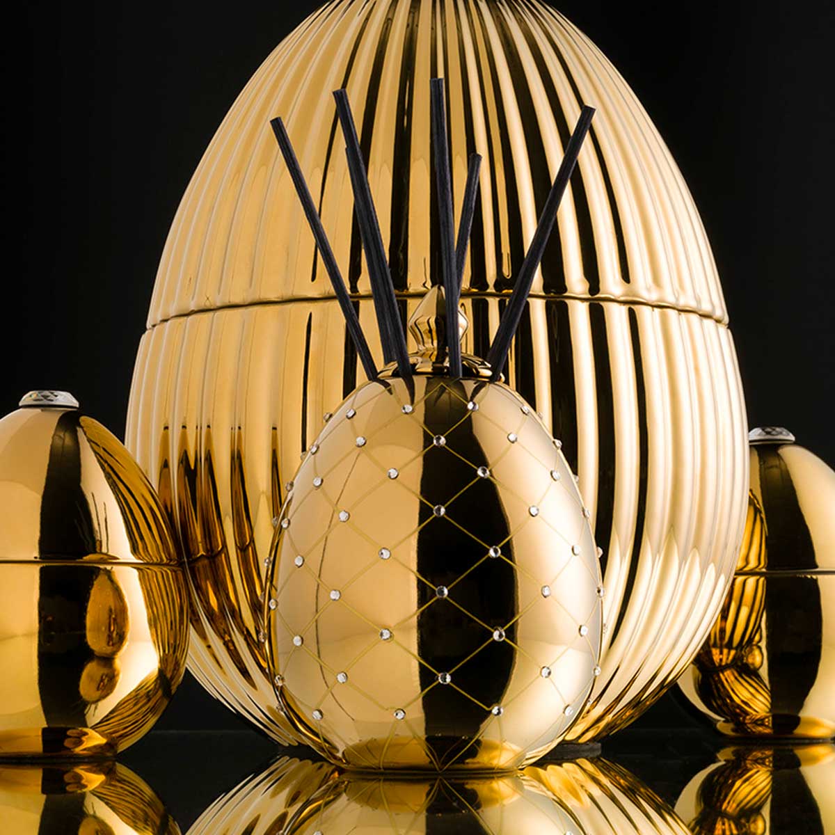 • 1 x Diffusore di tipo Reed  a forma di uovo in Oro e Cristalli dalla capacità massima di 350ml