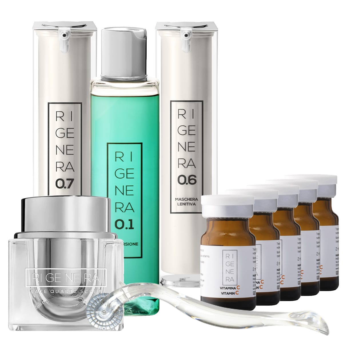Il Kit per Pelli Normali di Rigenera è un trattamento intensivo per pelli senza inestetismi noti. Per tutte le persone la cui pelle ha un tono non troppo maturo e andante verso un’età oltre al giovanile, Rigenera ha progettato il Kit per Pelli Normali per combattere l’invecchiamento della pelle. Sei prodotti Rigenera pensati per migliorare la texute dell’epidermide, stimolare attivamente la produzione di collagene cosi da ridurre la comparsa di rughe e linee sottili. Utilizzando regolarmente il Kit per Pelli Normali di Rigenera, noterai una pelle visibilmente più giovane, luminosa e sana nel tempo. I benefici della vitamina C combinati con il il detergente Rigenera 0.1, lo Scrub Viso di Rigenera, il dermaroller con 540 aghi, la maschera lenitiva di Rigenera 0.6 e la crema decongestionante Rigenera 0.7 ti permetteranno di affrontare i segni dell’invecchiamento in modo efficace, donando alla tua pelle un aspetto fresco e radiante.